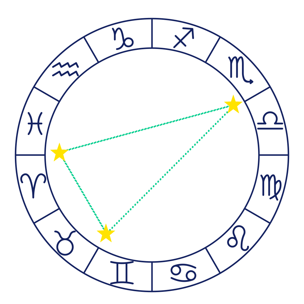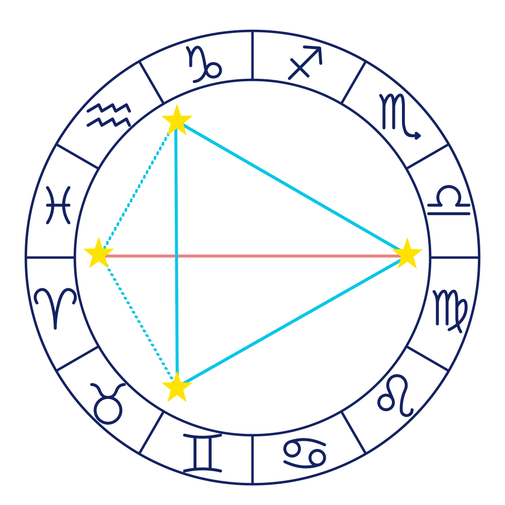 ホロスコープ上に現れる大きな正三角形(通常は同じ元素の3つの星座に天体が入る)=グランドトライン。その一つの頂点から、ちょうど180度反対の位置にも天体が加わると、「カイト」と呼ばれる配置になる。