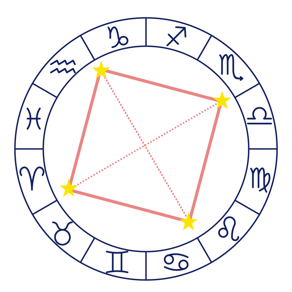 ホロスコープ上で、4つの天体が90度ずつ離れて配置され、巨大な十字を描くアスペクト。それぞれ異なる4つの方向性にマインドが引き裂かれるように作用し、大きな緊張や葛藤を生み出す。